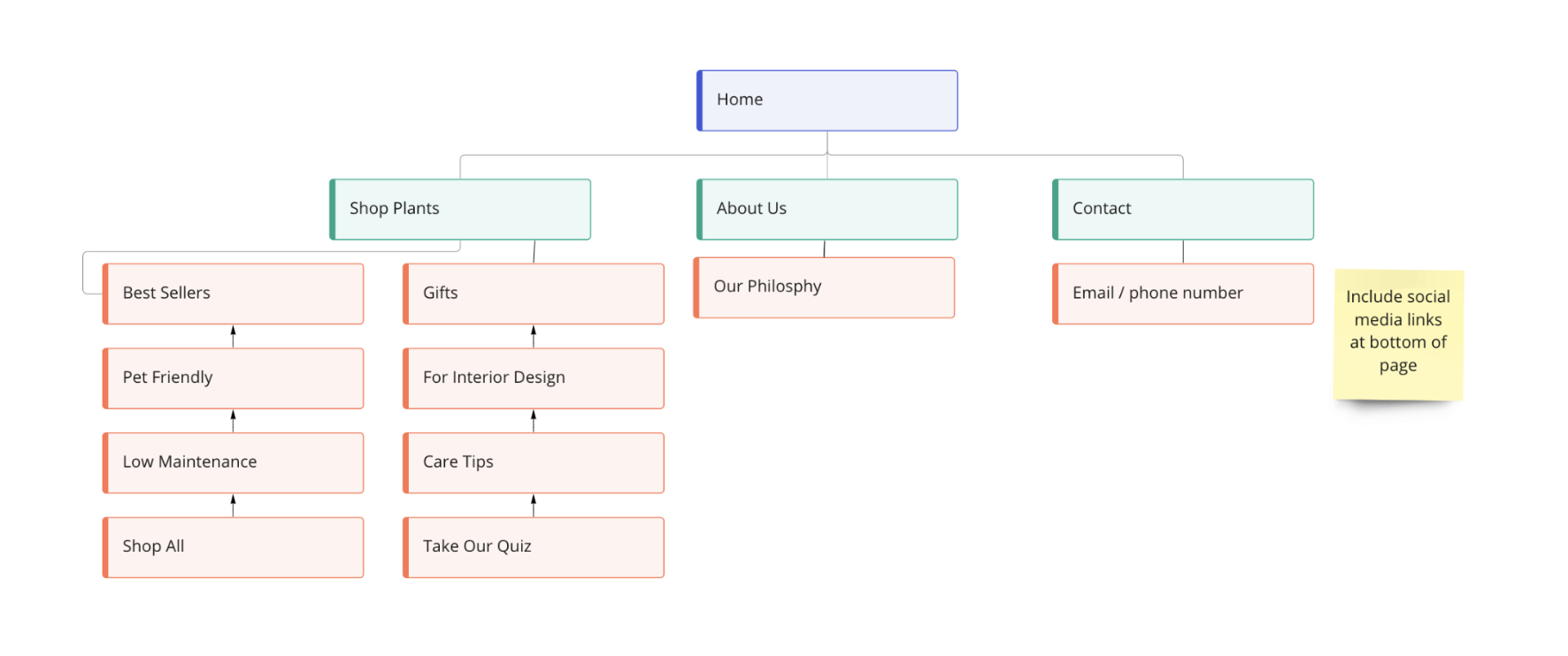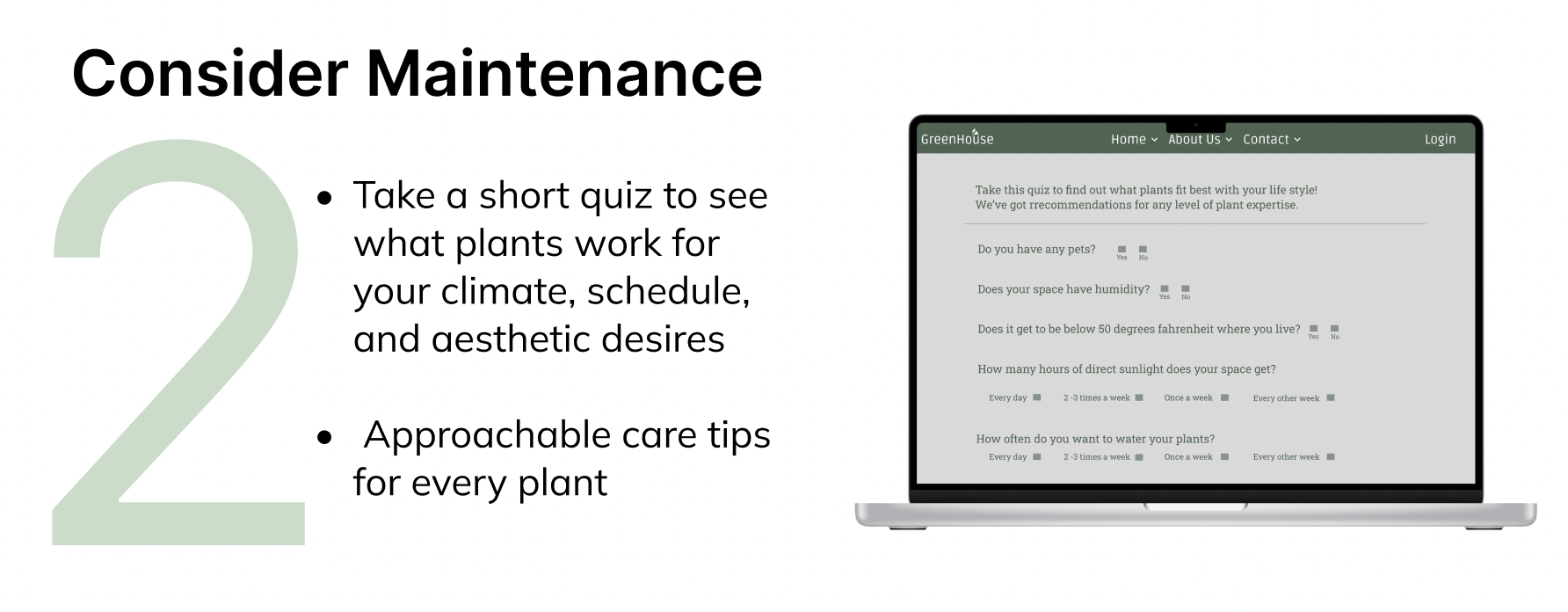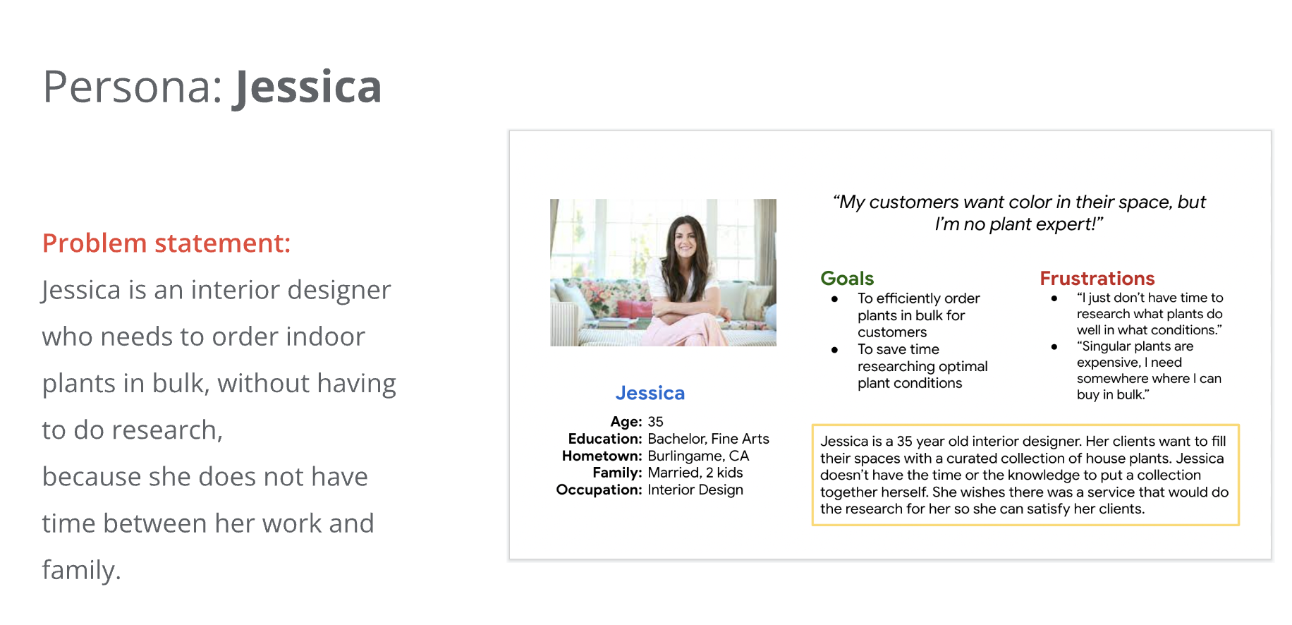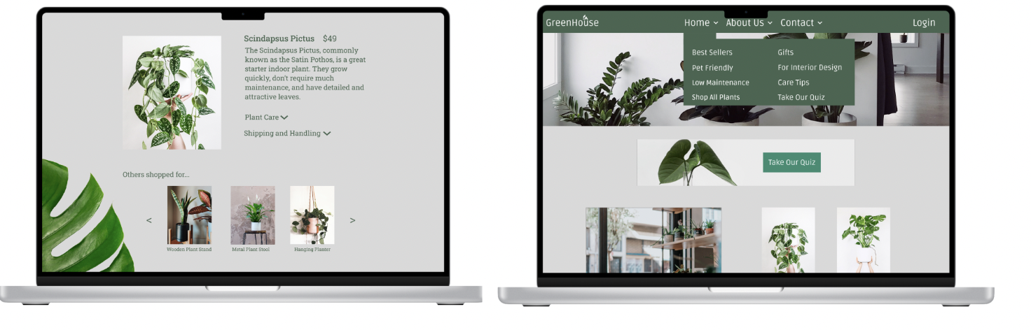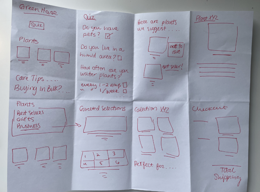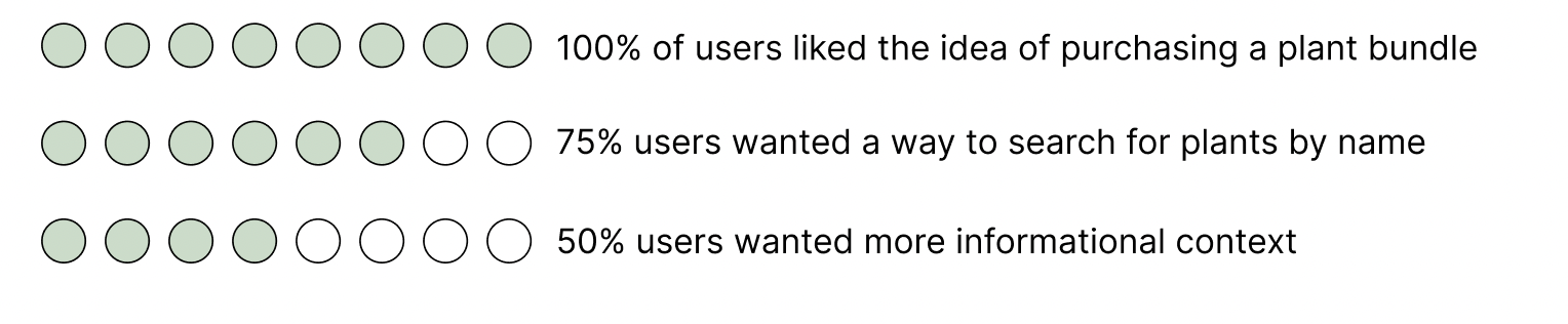 I conducted an unmonitored interview with 8 potential users. My assumption going into the project was that users would want a few plants to decorate their home. I discovered that the variety of users exceeded my initial thought — users are looking for plants that provide air purification, users are looking for pet friendly plants, and users are looking for plants in bulk. I changed my mindset to design a website that is more than an e-commerce system, but to one that provides support.